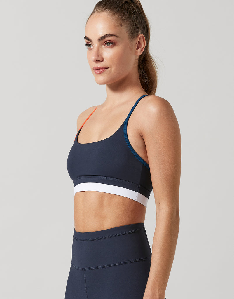 Designed for light support during yoga and Pilates, the Lilybod Kenya-XR Sports Bra in Carbon Blue features a strappy design with a keyhole detail in the back to enhance breathability and freedom of movement. Its sleek construction offers a secure, comfortable fit ideal for low-impact activities, ensuring you stay focused while maintaining style and functionality.